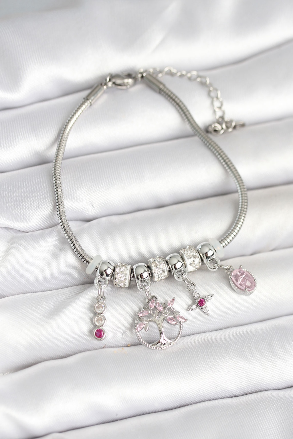 Pirinç Gümüş Renk Yaşam Ağacı Charmlı Kadın Bileklik - Lisinya