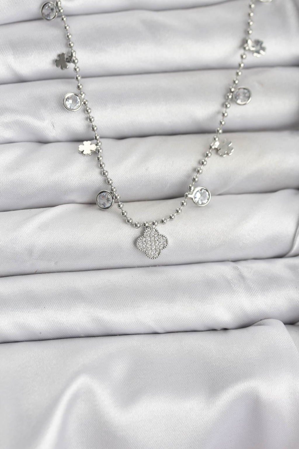 Pirinç Gümüş Renk Yonca Model Kadın Kolye - Lisinya