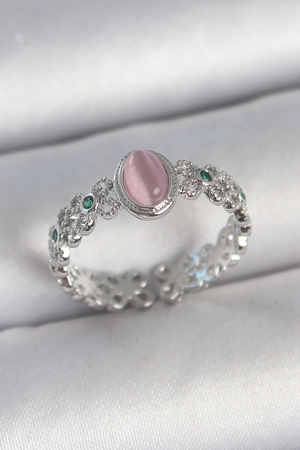 Pirinç Gümüş Renk Zirkon Taş Detaylı Pembe Mineli Damla Model Ayarlanabilir Kadın Yüzük - Lisinya