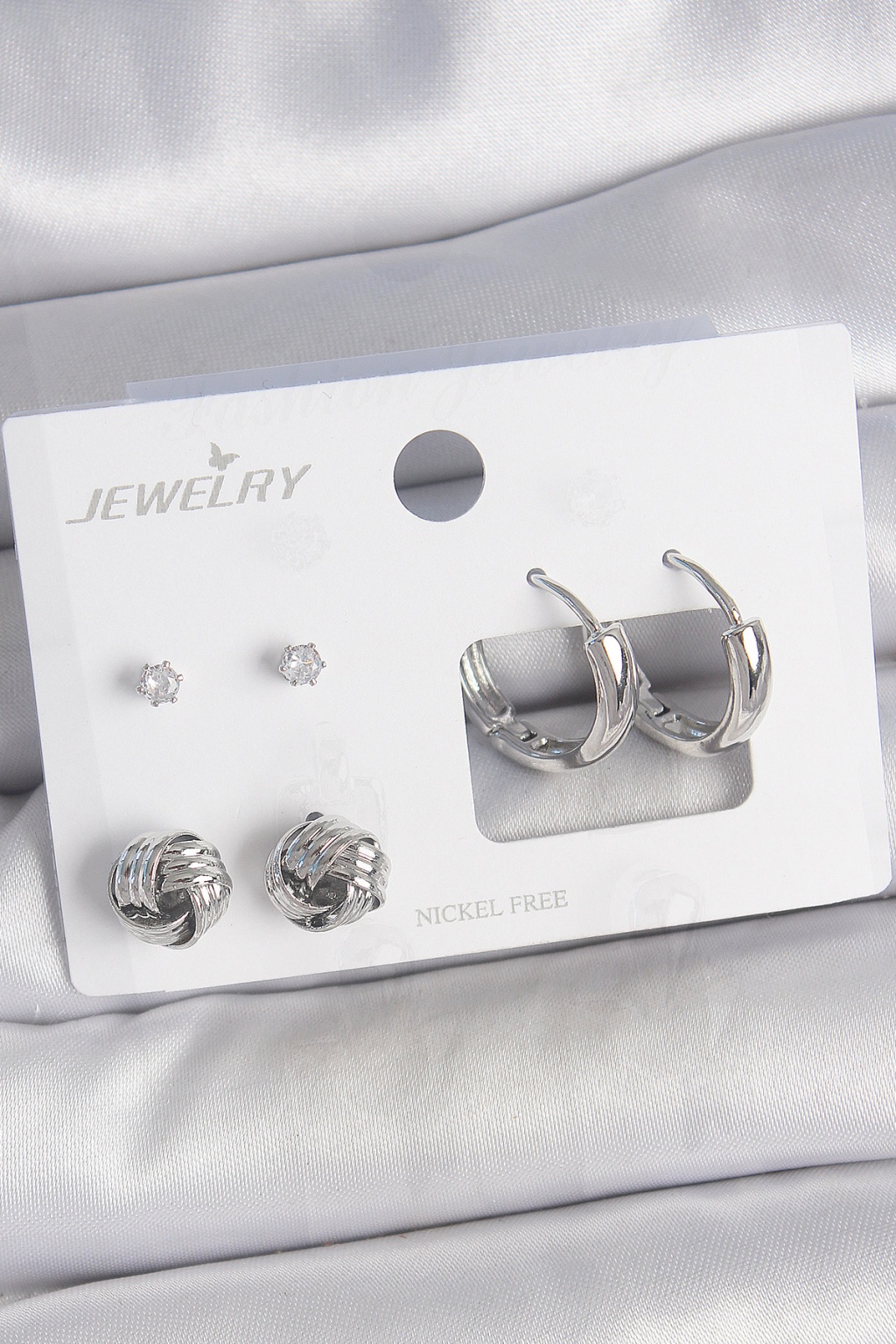 Pirinç Gümüş Renk Zirkon Taşlı Halka Model 3 Çift Kadın Küpe Seti - Lisinya