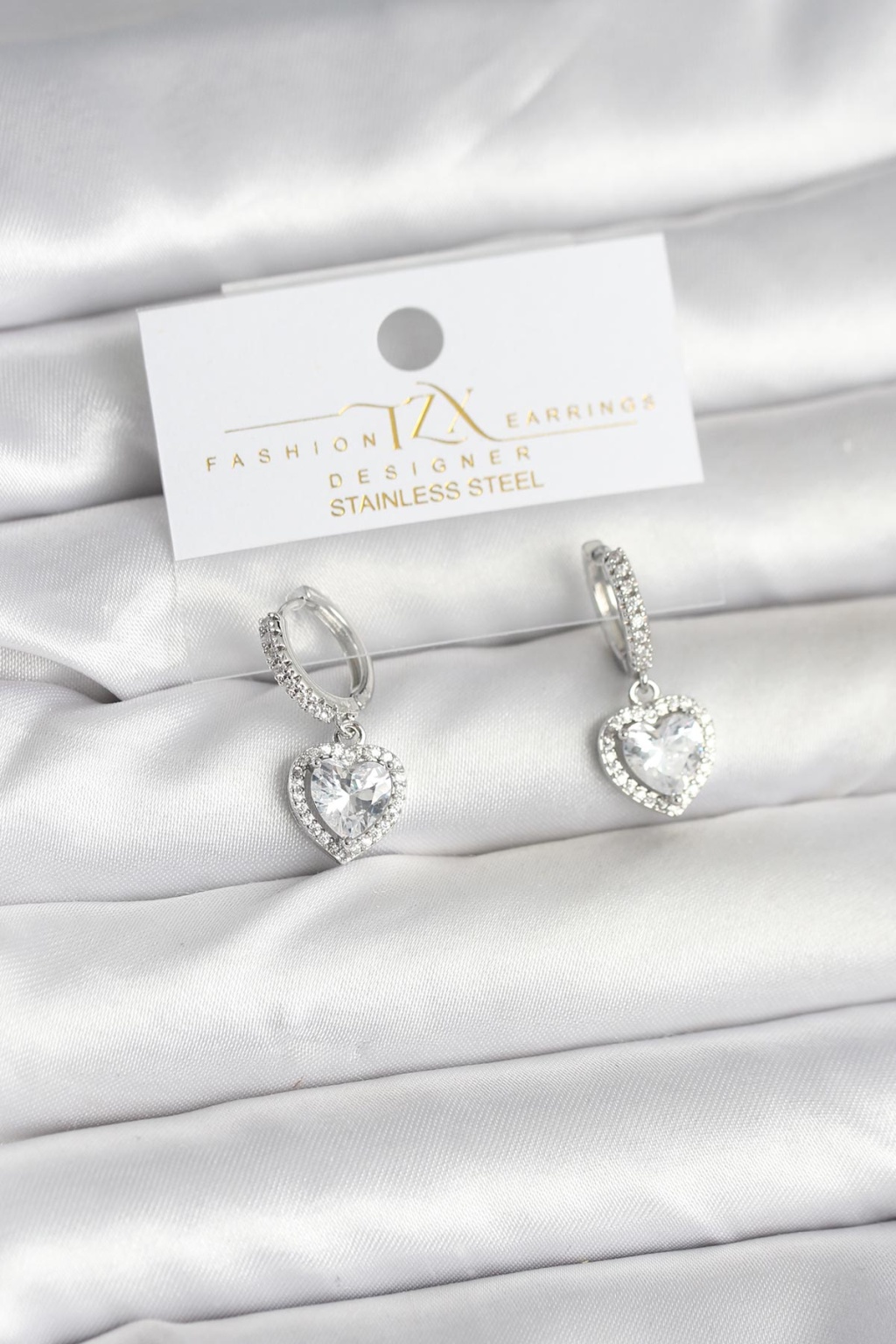 Pirinç Gümüş Renk Zirkon Taşlı Kalp Model Kadın Küpe - Lisinya