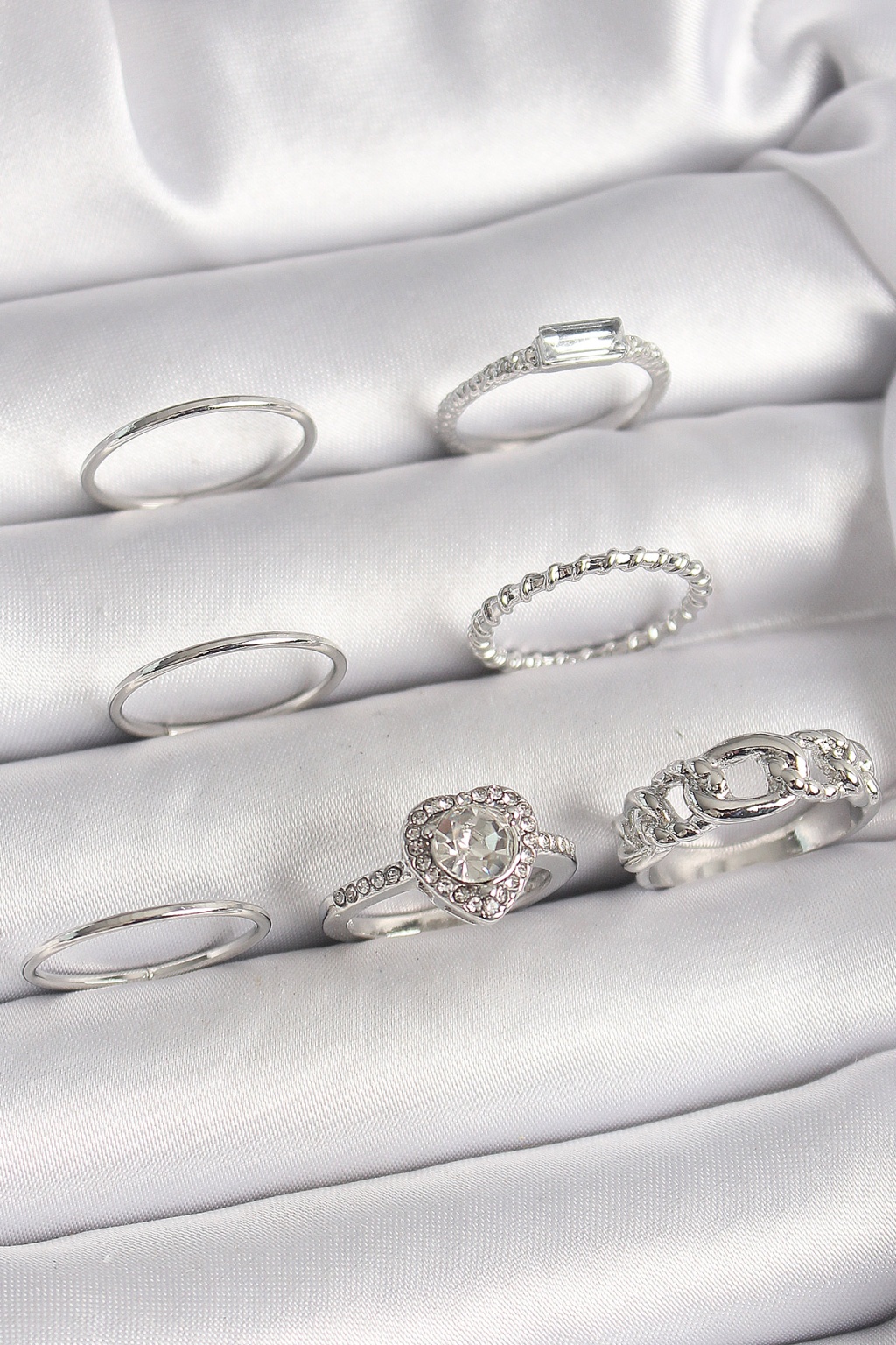 Pirinç Gümüş Renk Zirkon Taşlı Kalp Model Kadın Yüzük Kombini -
