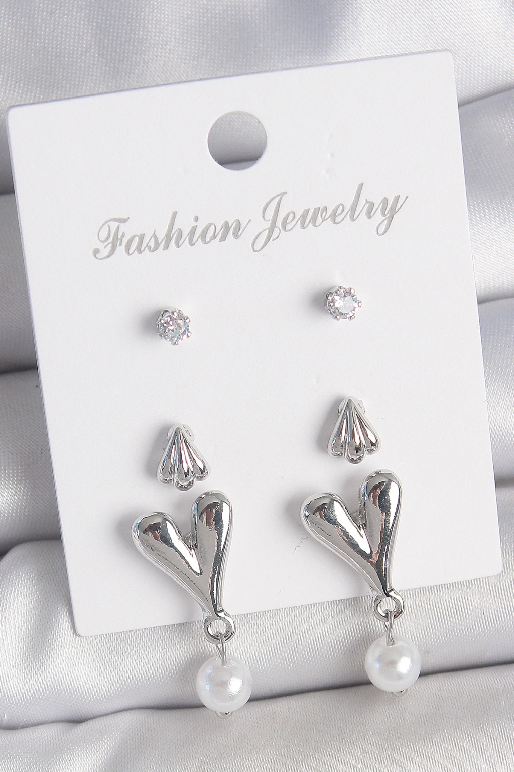 Pirinç Gümüş Renk Zirkon Taşlı Sallantılı Kalp Model 3 Çift Kadın Küpe Seti - Lisinya