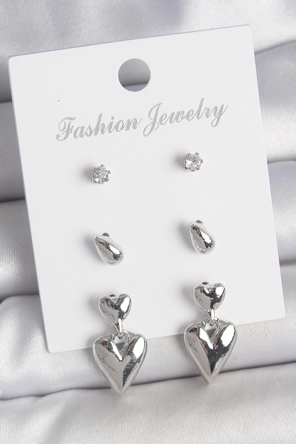 Pirinç Gümüş Renk Zirkon Taşlı Sallantılı Kalp Model 3 Çift Kadın Küpe Seti - Lisinya