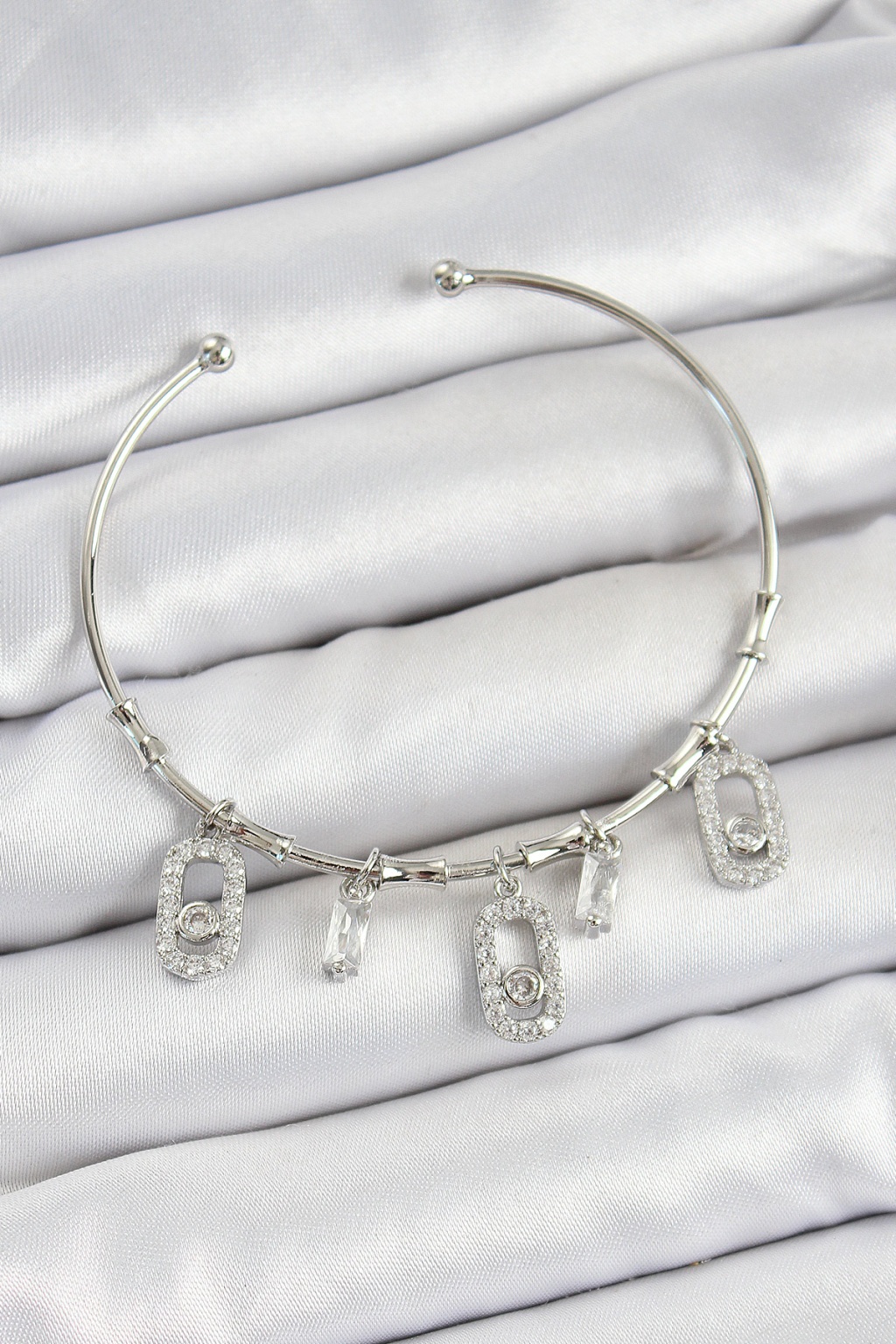 Pirinç Zirkon Taşlı Dikdörtgen Model Gümüş Renk Charm Bileklik - Lisinya