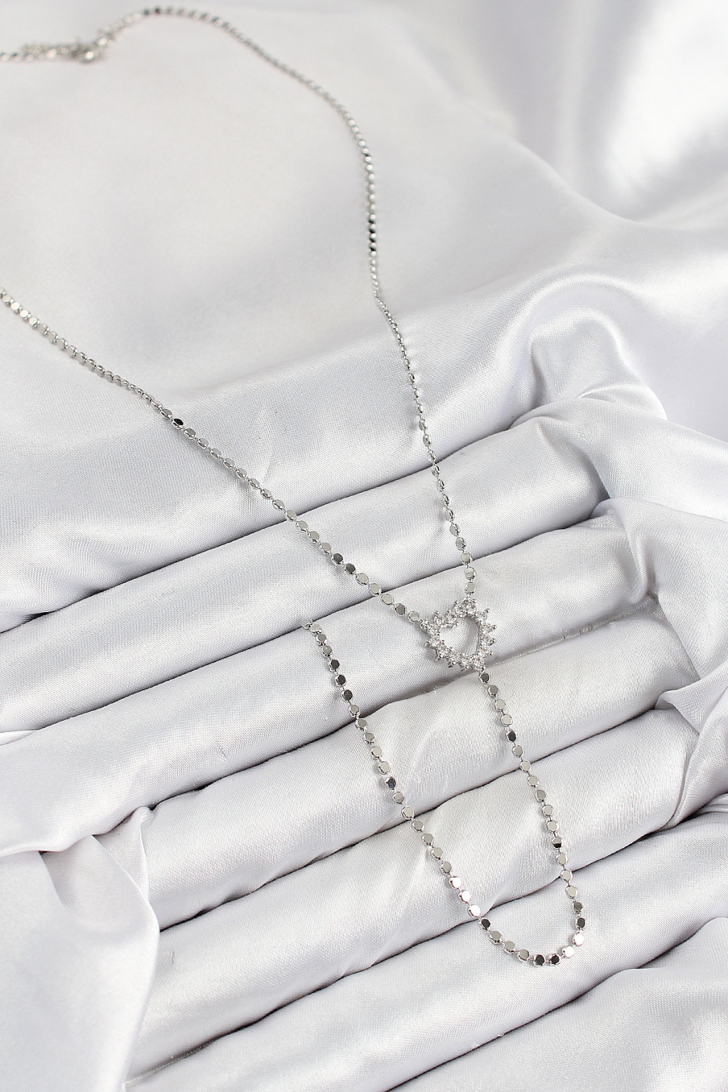 Pirinç Zirkon Taşlı Ezme Zincirli Kalp Model Gümüş Renk Y Kolye -