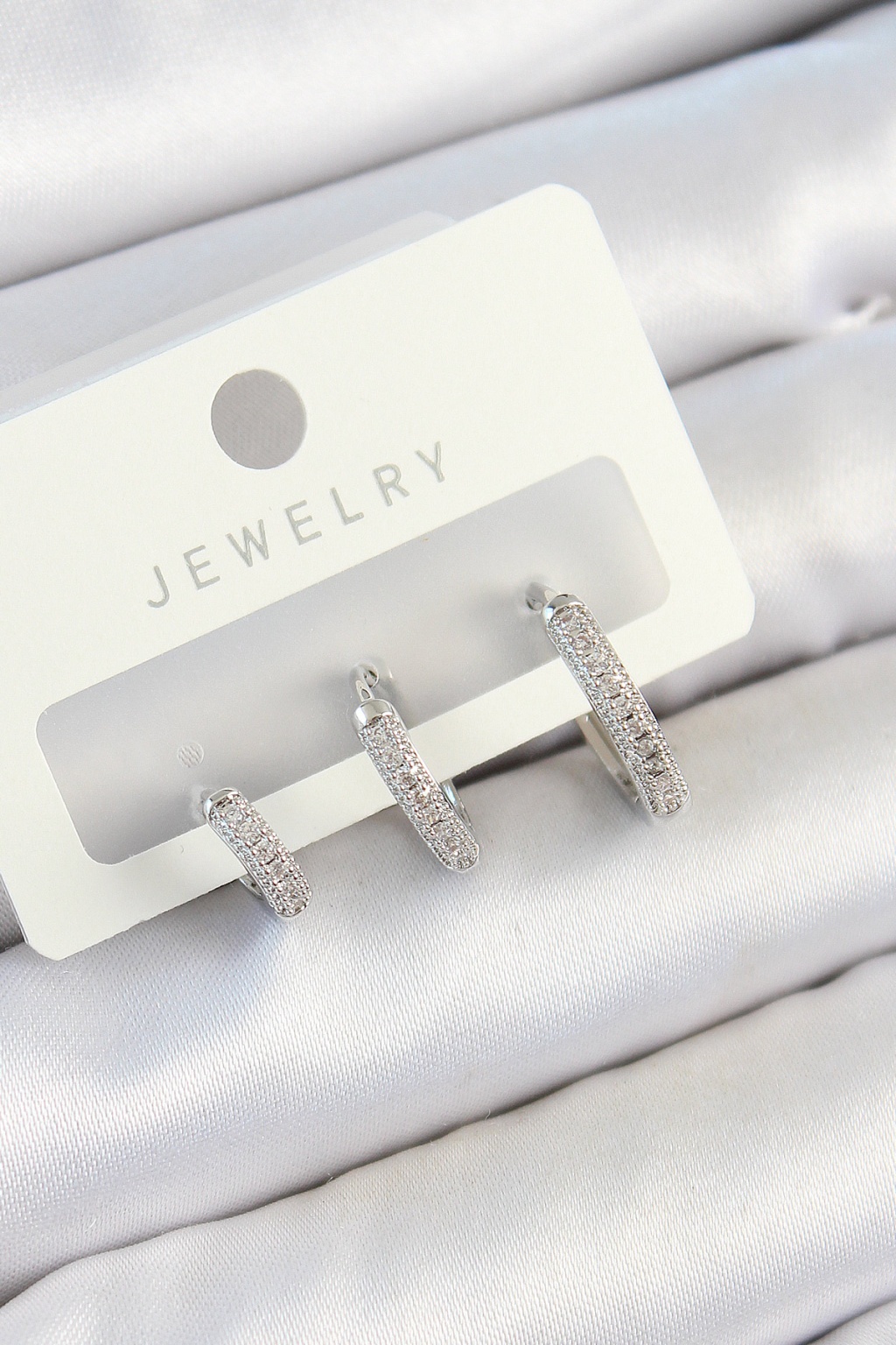 Pirinç Zirkon Taşlı Halka Model Gümüş Renk 3'lü Çift Kadın Küpe Set - Lisinya
