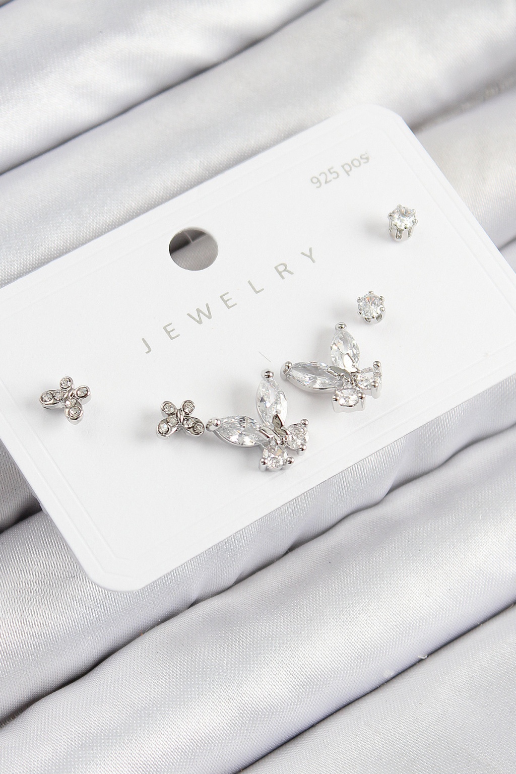 Pirinç Zirkon Taşlı Kelebek Model Gümüş Renk 925 Ayar Gümüş Çivi Kadın Küpe Set -