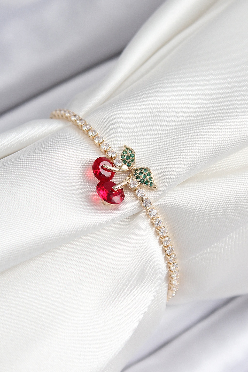 Pirinç Zirkon Taşlı Kiraz Model Gold Renk Asansörlü Kadın Bileklik - Lisinya