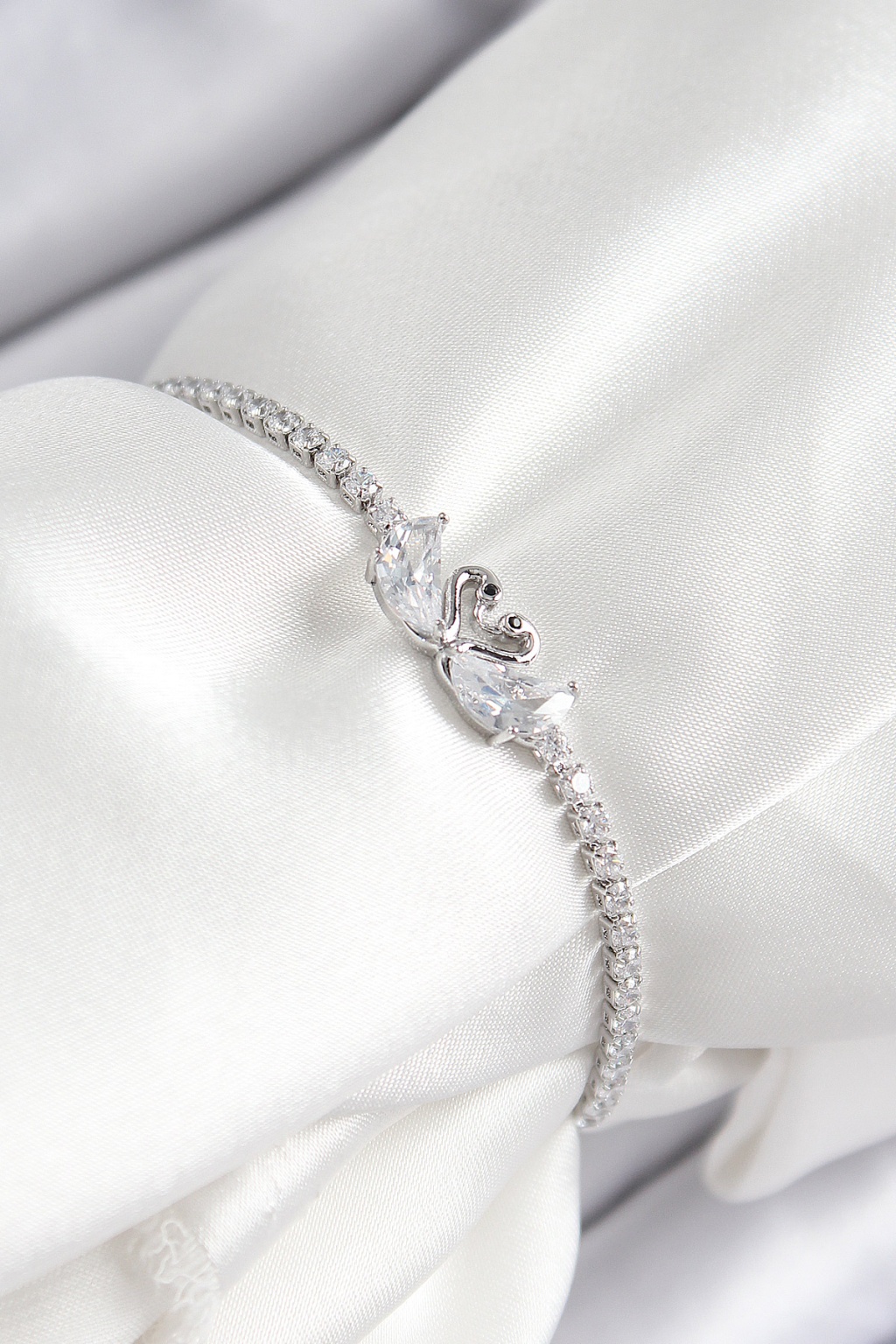 Pirinç Zirkon Taşlı Kuğu Model Gümüş Renk Asansörlü Kadın Bileklik - Lisinya