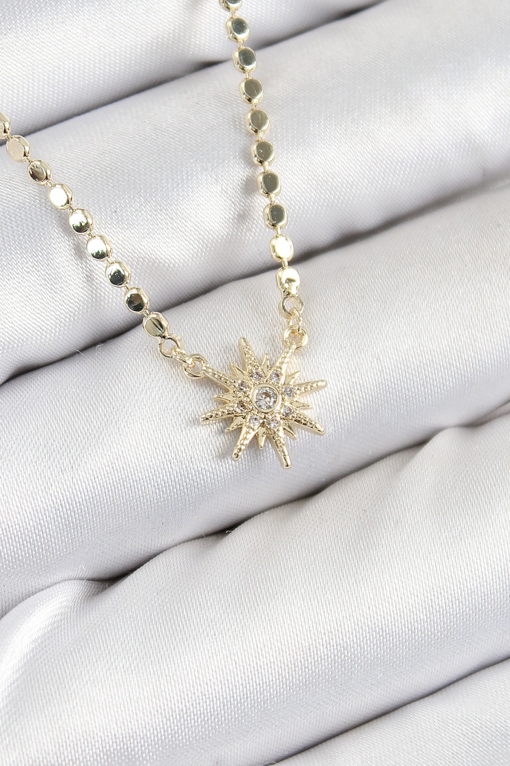 Pirinç Zirkon Taşlı Kutup Yıldızı Model Ezme Zincir Gold Renk Kadın Kolye -