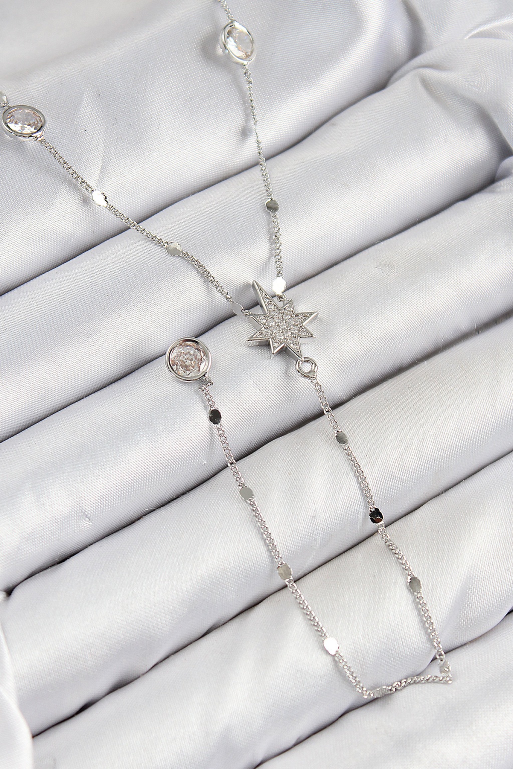 Pirinç Zirkon Taşlı Kutup Yıldızı Model Gümüş Renk Y Kolye -