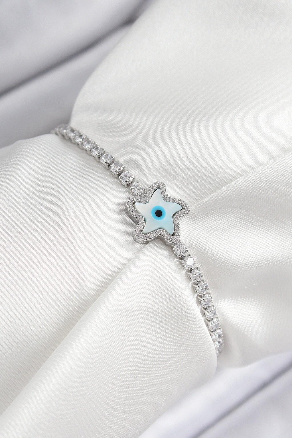 Pirinç Zirkon Taşlı Nazar Yıldız Model Gümüş Renk Asansörlü Kadın Bileklik - Lisinya