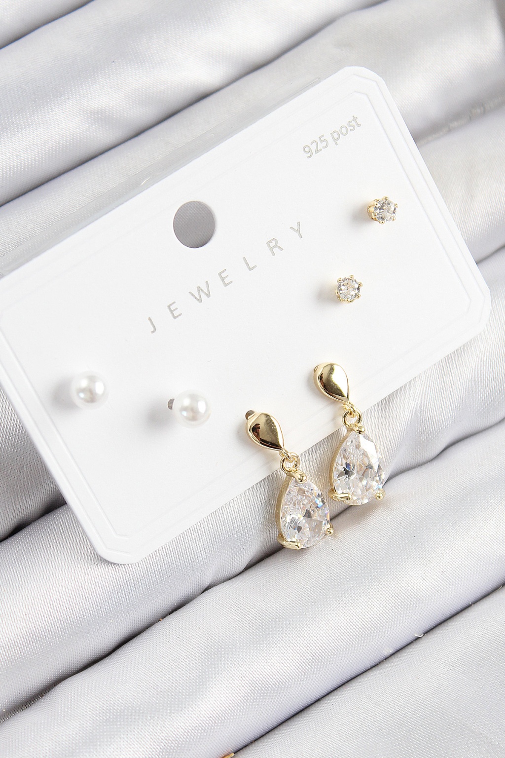 Pirinç Zirkon Taşlı Sallantılı Damla Model Gold Renk 925 Ayar Gümüş Çivi Kadın Küpe Set -