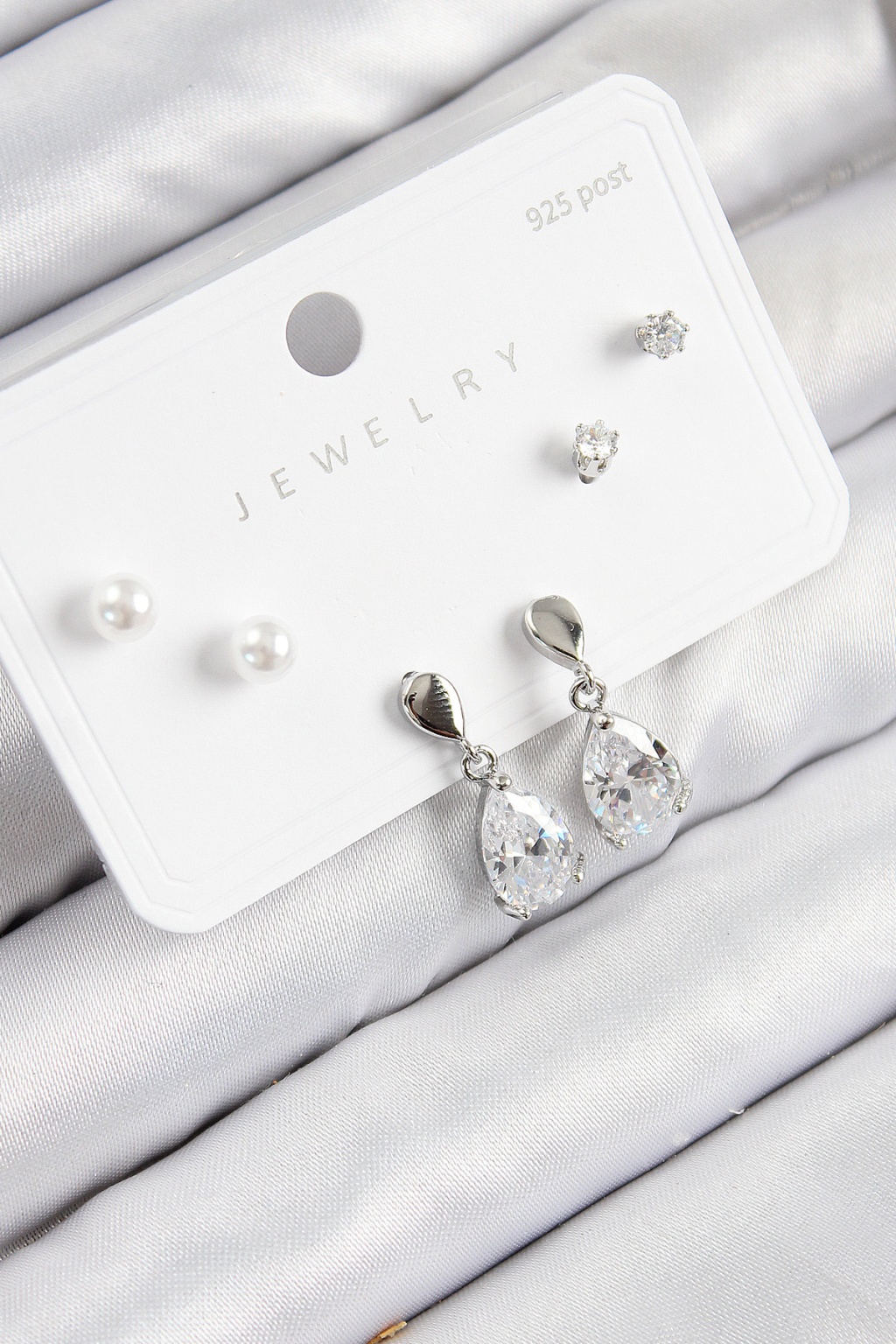 Pirinç Zirkon Taşlı Sallantılı Damla Model Gümüş Renk 925 Ayar Gümüş Çivi Kadın Küpe Set -