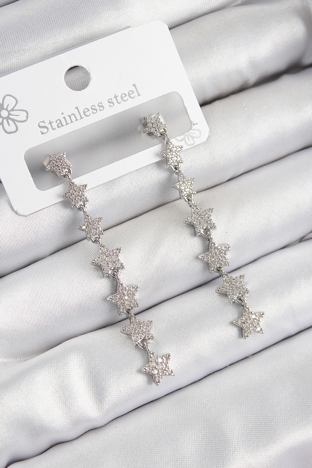 Pirinç Zirkon Taşlı Sallantılı Yıldız Model Gümüş Renk Kadın Küpe - Lisinya