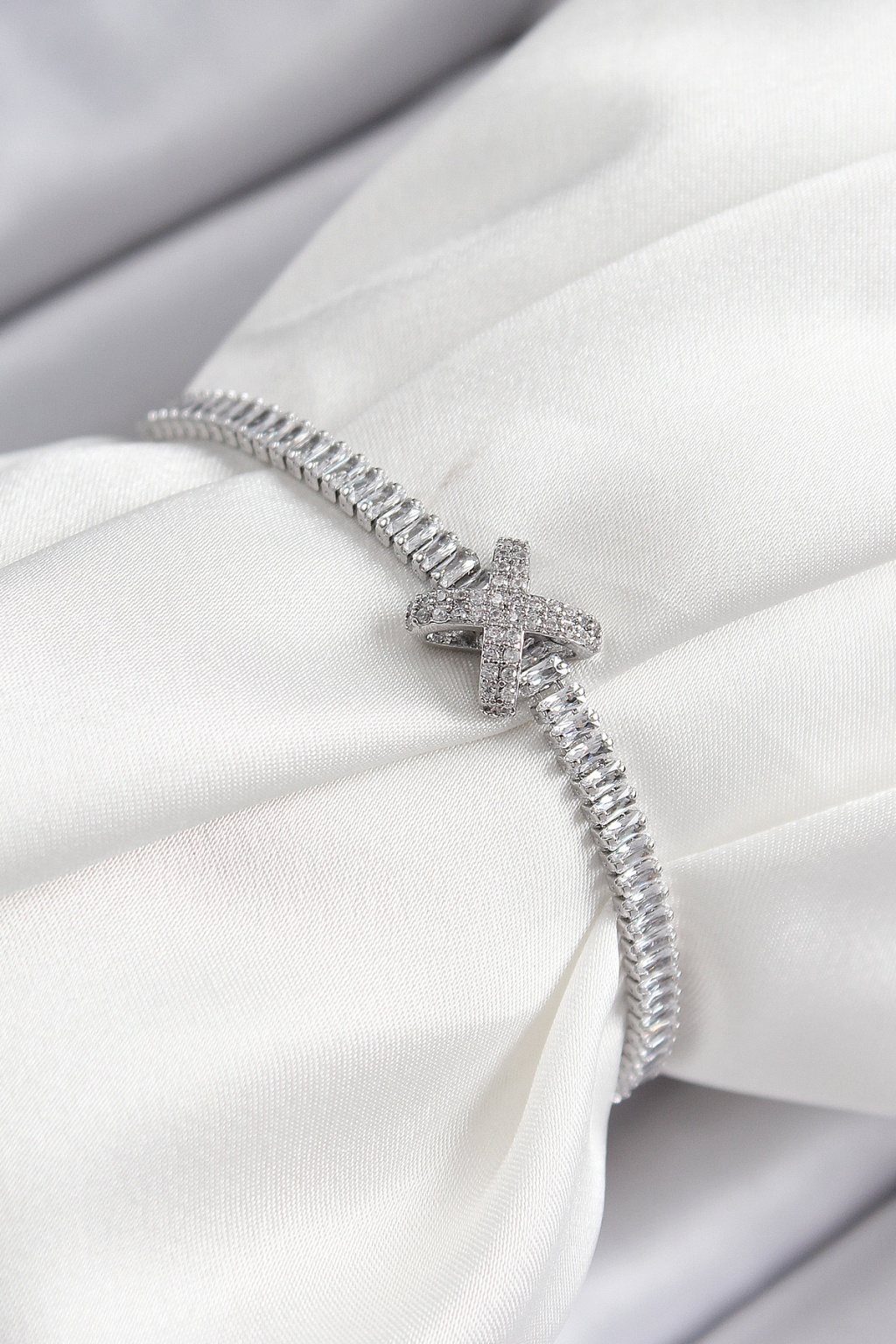 Pirinç Zirkon Taşlı X Detaylı Su Yolu Model Gümüş Renk Asansörlü Kadın Bileklik - Lisinya