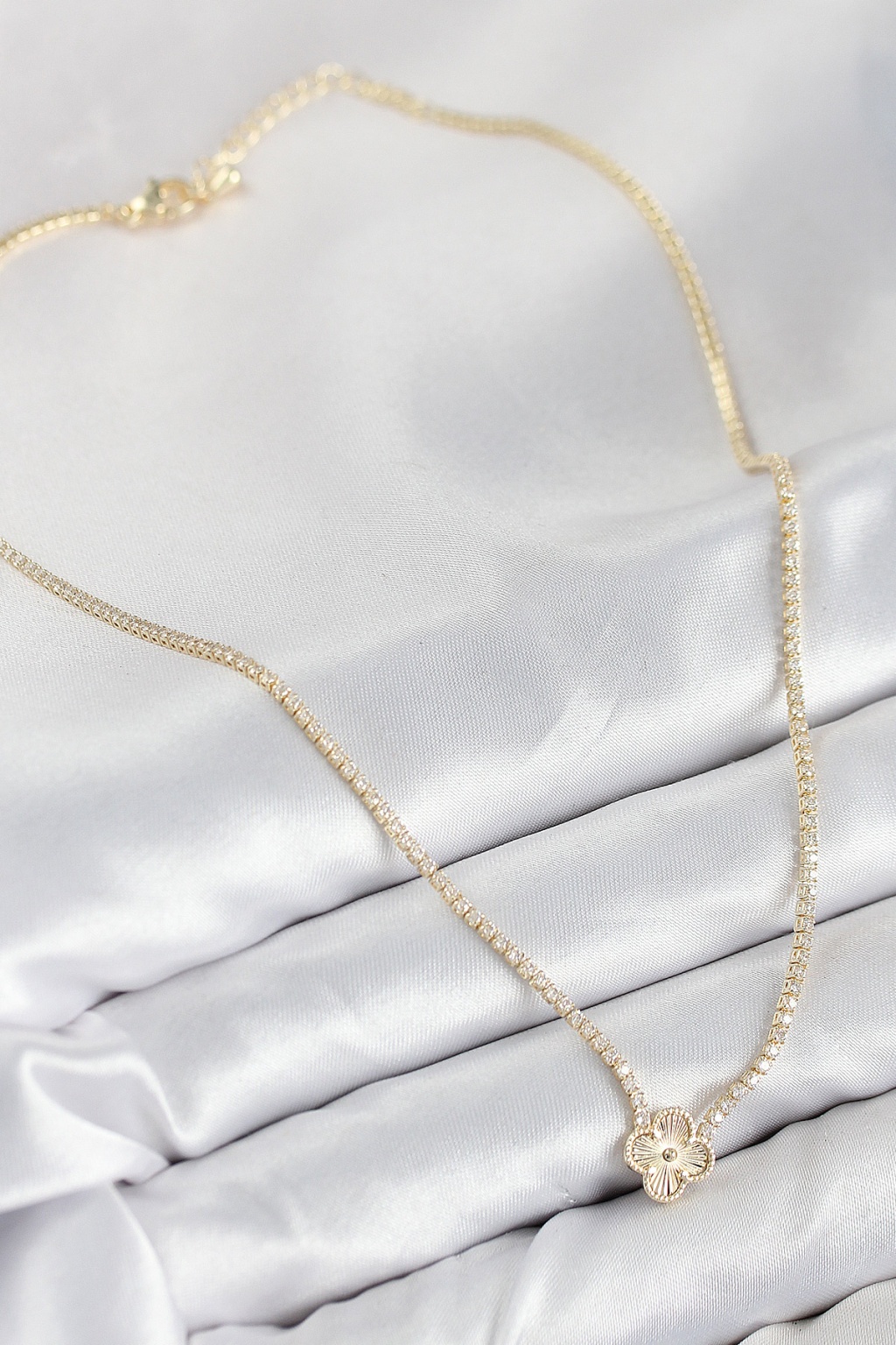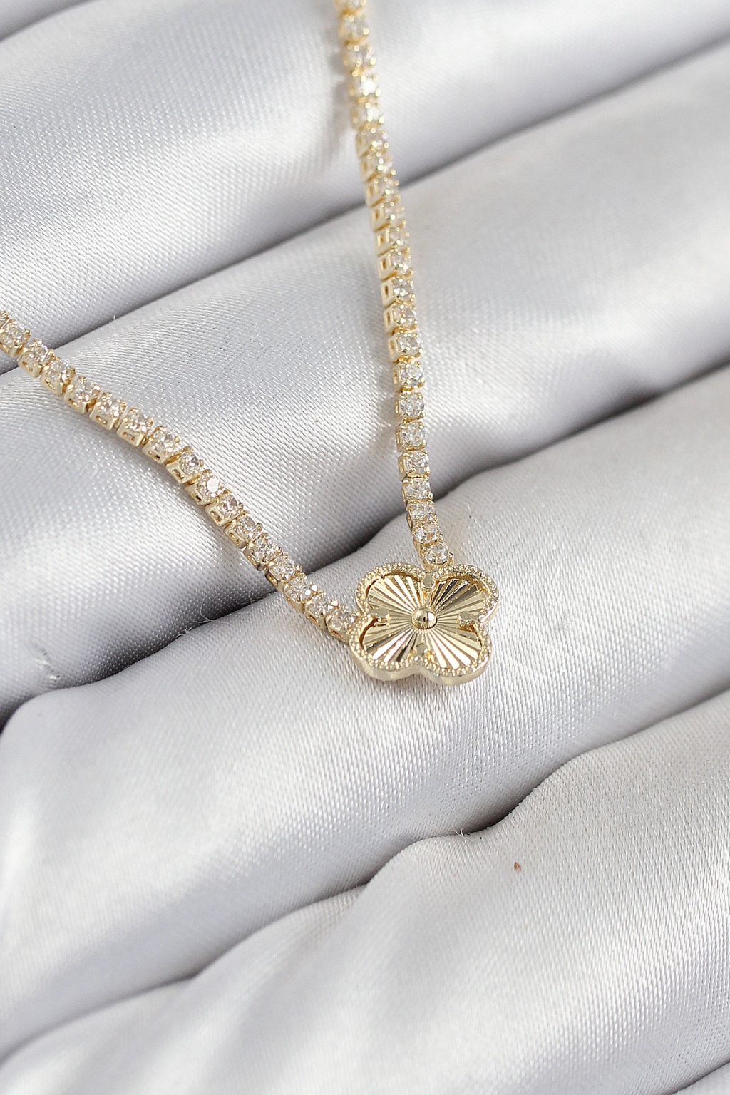 Pirinç Zirkon Taşlı Yonca Model Gold Renk Kadın Kolye -
