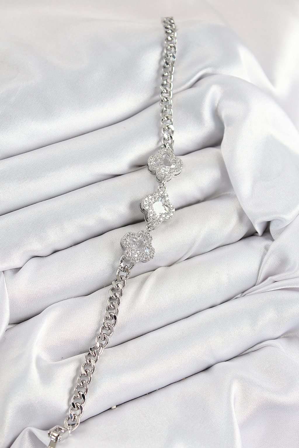 Pirinç Zirkon Taşlı Yonca Model Gümüş Renk Kadın Bileklik - Lisinya
