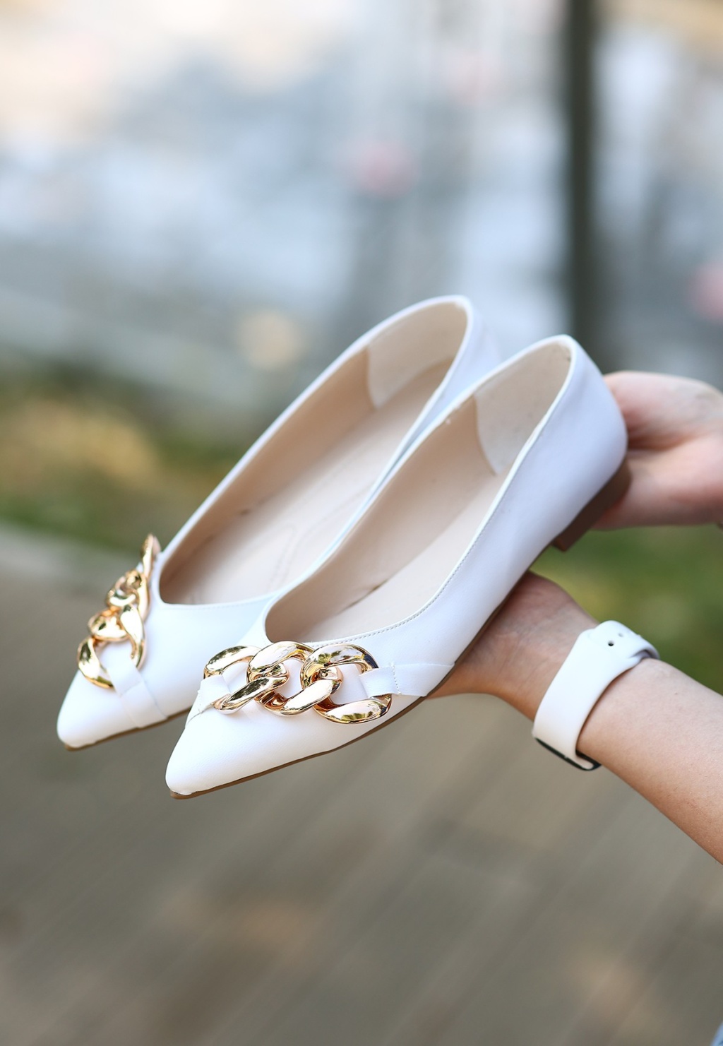 Popi Beyaz Cilt Zincirli Babet Ayakkabı -