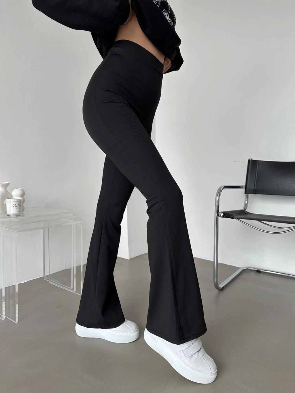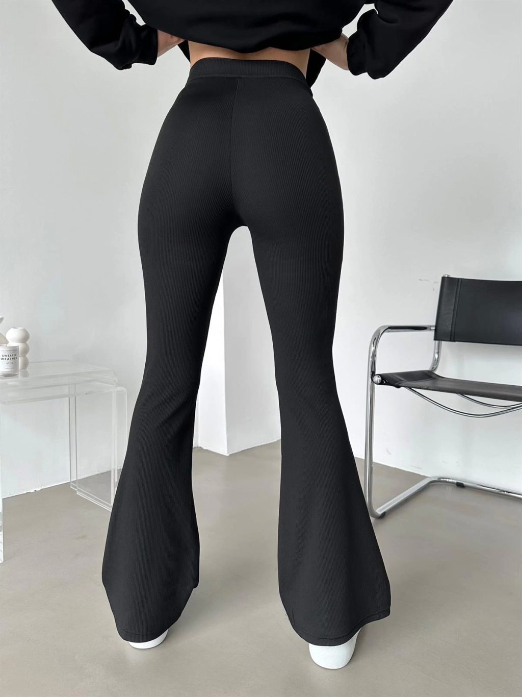 Şık Ve Rahat Yüksek Bel İspanyol Paça Fitilli Toparlayıcı Siyah Tayt