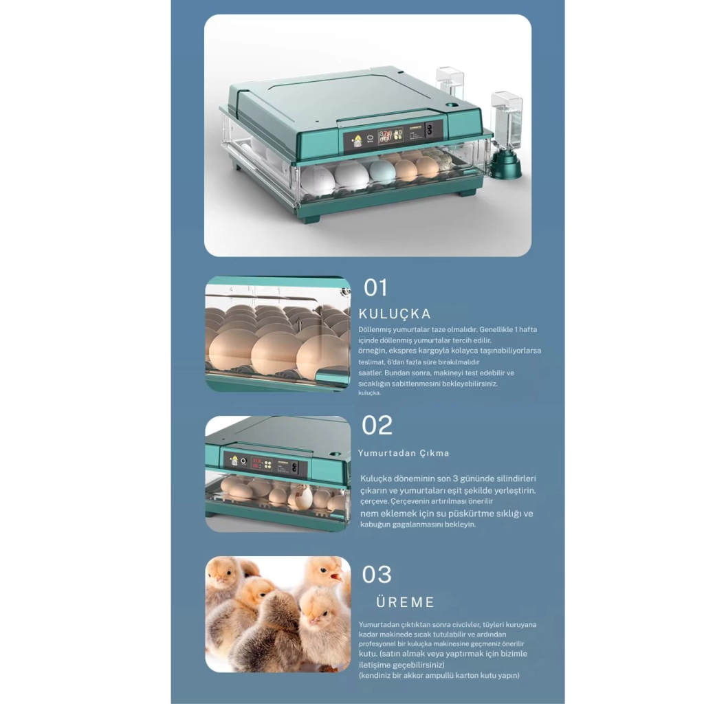 Slim Model 130`lu Portatif Gün Sayaçlı Tam Otomatik Kuluçka Makinesi ndash; Yedek Motor + Su Kabı + Videolu Kullanma Kılavuz HediyeYüksek çıkım oranı, kullanıcı dostu tasarım ve tam otomatik sistem! Slim yeni model 130 yumurtalık kuluçka makinesi, civciv, kaz, ördek ve kuş yumurtaları için yüksek verimlilik sunar. Hem portatif yapısıyla yer kaplamaz hem de gelişmiş teknolojisi ile minimum müdahale gerektirir. Şimdi, ekstra yedek motor, su kabı, QR kodlu videolu kurulum rehberi ve Türkçe kullanım kılavuzu ile birlikte!Tam Otomatik Kontrol Sistemi Sıcaklık ve nem seviyesi otomatik olarak düzenlenir. Dijital ekran sayesinde tüm değerler anlık takip edilebilir. 2 Saatte Bir Otomatik Yumurta Çevirme Embriyonun eşit gelişimi için yumurtalar düzenli olarak çevrilir. Yüksek çıkım oranına katkı sağlar. Gün Sayaçlı Sistem Dijital ekran üzerindeki gün sayacı ile kuluçka süreci kolayca takip edilir. Portatif ve Ergonomik Tasarım Hafif, taşınabilir ve yer kaplamaz. Kolay kurulum, basit kullanım. Hediyeler ve Ekstralar Yedek motor: Olası arızalara karşı yedekli sistem. Su kabı lavabo seti: Nem dengesini korumak için gerekli donanım. QR Kodlu Videolu Kurulum Rehberi: Kurulum adımlarını videolu anlatımla kolayca takip edin. Türkçe Kullanma Kılavuzu: Her ayrıntı elinizin altında. Kapasite: Tavuk Yumurtası: 130 adet Kaz / Ouml;rdek / Hindi Yumurtaları: Uyumlu Bıldırcın / Güvercin Yumurtaları: Uygun aparatlar ile Teknik Detaylar: Malzeme: Yüksek kalite dayanıklı PP plastik Otomatik: Sıcaklık, nem, yumurta çevirme Dijital ekran, gün sayacı Sessiz fan sistemi ndash; düşük enerji tüketimi Ouml;lçüler: Kompakt ndash; kolay taşıma için ideal Ağırlık: Hafif ndash; portatif kullanım avantajı Paket İçeriği: 1 Adet Slim 130`luk Tam Otomatik Kuluçka Makinesi 1 Adet Yedek Motor 1 Adet Su Kabı ve Lavabo Seti QR Kodlu Videolu Kurulum Rehberi Türkçe Kullanma Kılavuzu Güvenli ambalaj ndash; Hızlı kargo desteği kuluçka makinesi, tam otomatik, 130 yumurta kapasiteli, portatif kuluçka cihazı, gün sayaçlı, otomatik yumurta çevirme, videolu kurulum, yedek motorlu kuluçka, civciv çıkarma makinesi, kaz ördek uyumlu kuluçka, yumurta çeviren makine. Ürün Markası: Lisinya