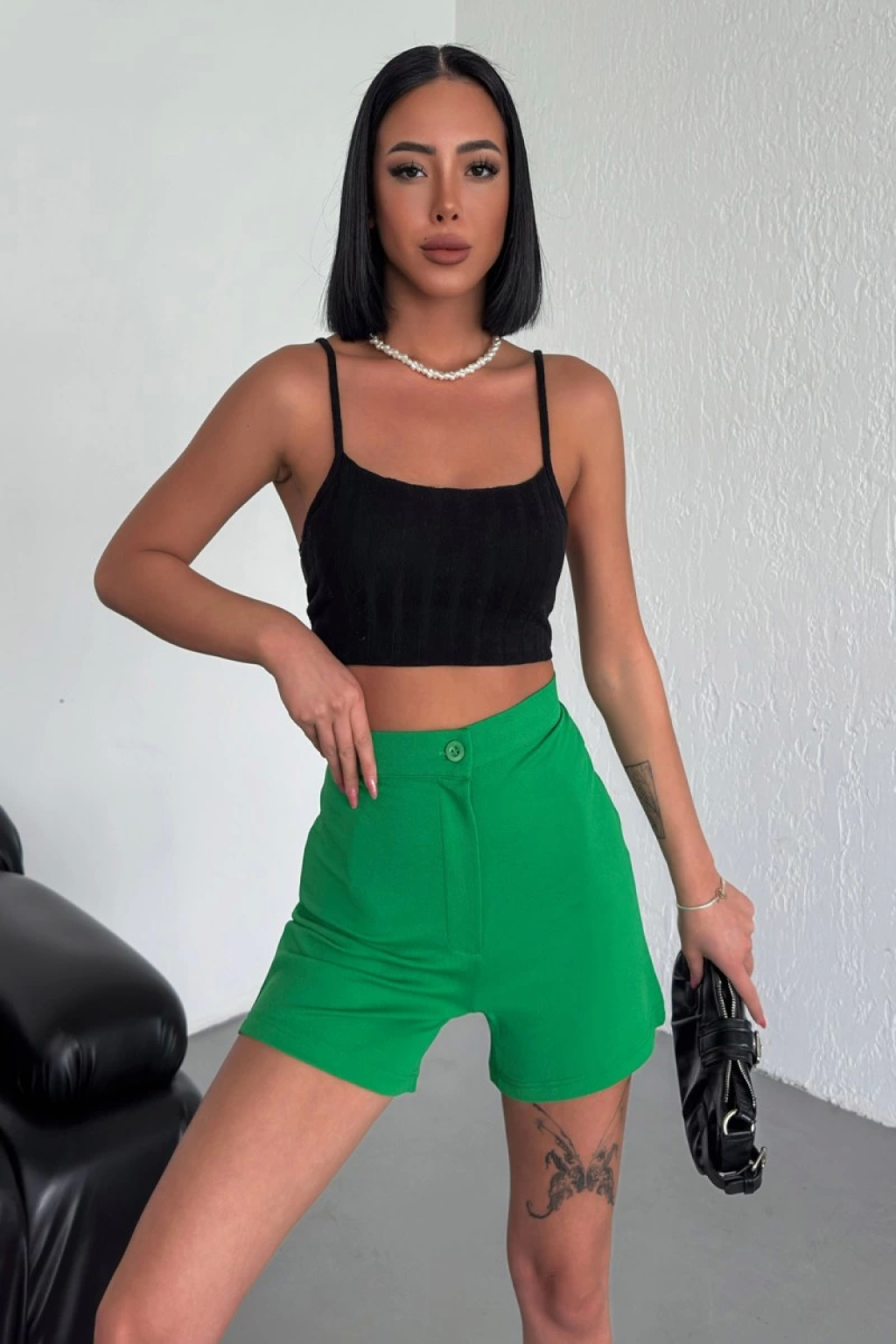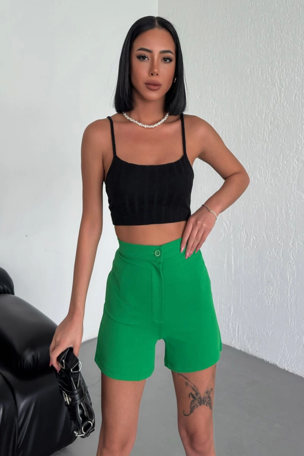 Tarz ve Rahatlığı Bir Arada Sunan Yüksek Bel Esnek Likralı Krep Şort Yeşil