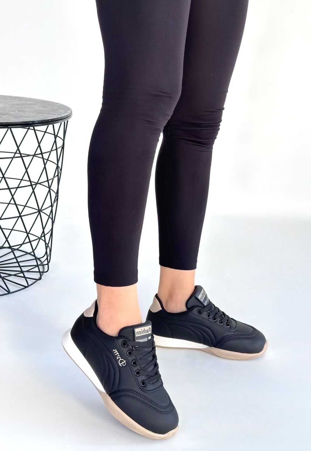 Tawen Siyah Cilt Bej Tabanlı Bağcıklı Spor Ayakkabı -