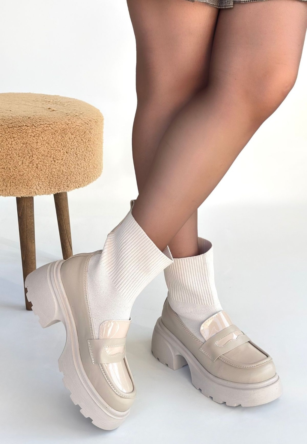 Renk: BejDetay: Streçili BotMalzeme: Cilt/TekstilTopuk Boyu: 5 cm.Taban Materyali: Poli Tabanİç Materyali: Pad'li İç Astar