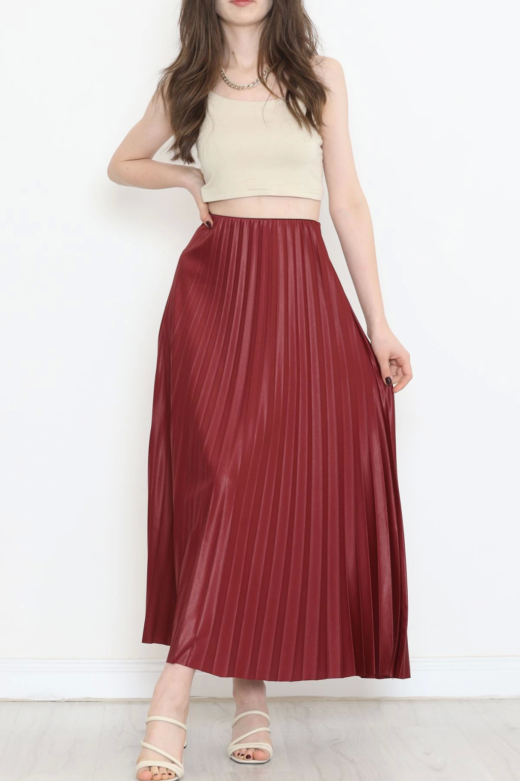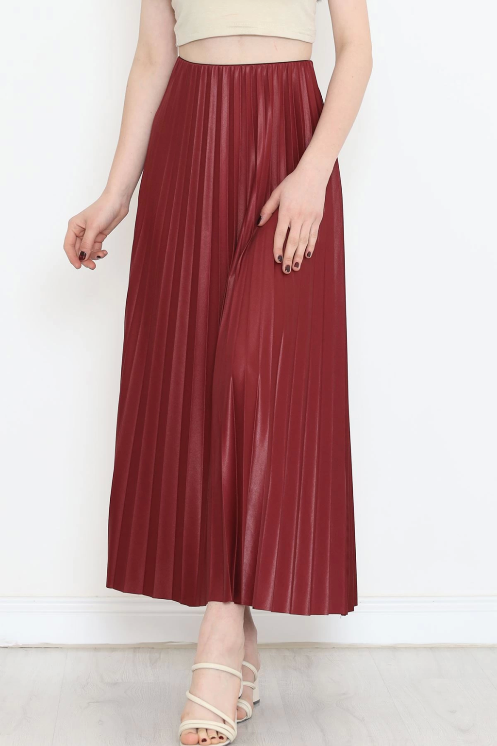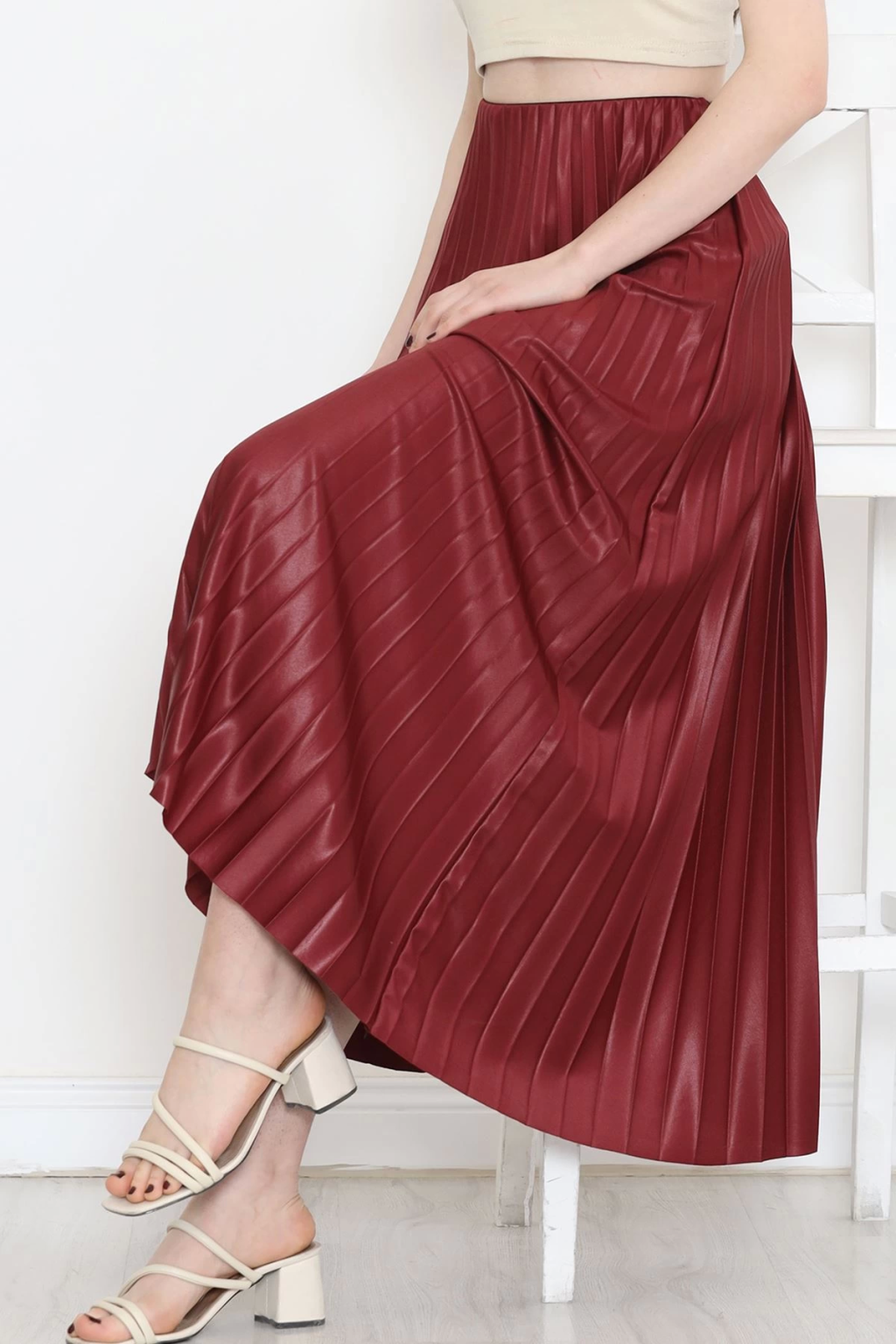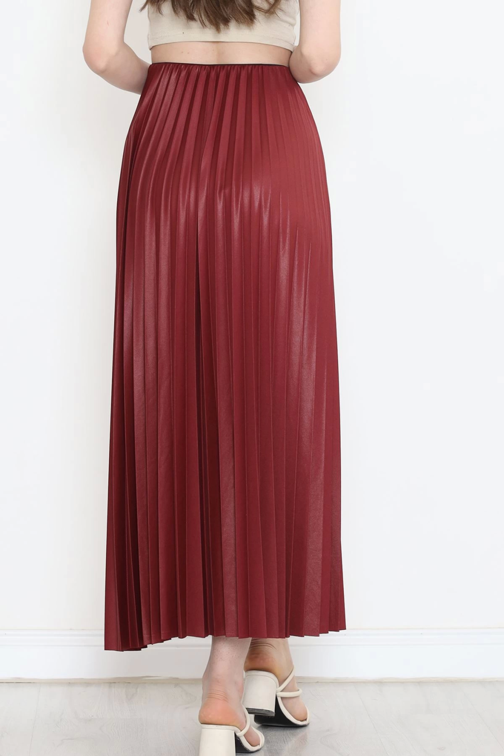 Zarif ve Modern Pileli Parlak Krep Gizli Lastikli Bordo Etek