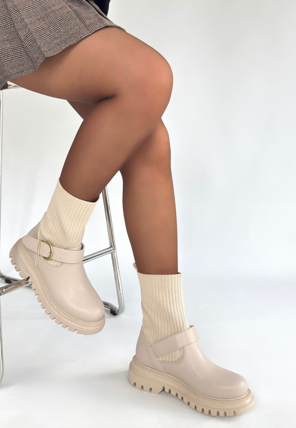 Renk: BejDetay: Streçili BotMalzeme: Rugan/TekstilTopuk Boyu: 3 cm.Taban Materyali: Poli Tabanİç Materyali: Pad'li İç Astar